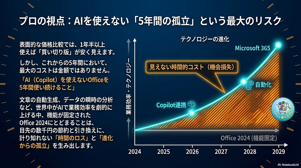 「これからの5年間、AI(Copilot)が使えないOfficeを使い続けるのは、業務効率の面で圧倒的に損」だと考えています。