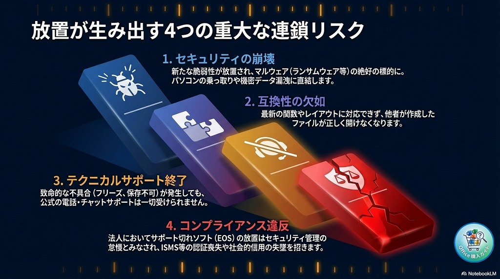 新しいバージョンのOfficeや、他のソフトウェアとの連携テストが行われなくなります。 - 影響: