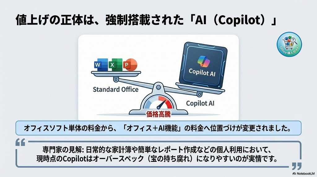 このように、日々の作業を劇的に効率化できる強力な機能が追加されました。しかし裏を返せば、「AI機能(Copilot)は使わない」というユーザーにとっては、純粋な維持コスト(価格)の負担増となってしまいます。