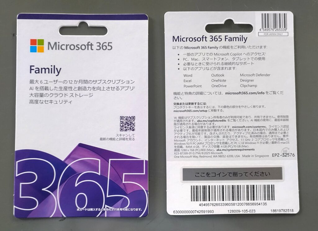 - 家電量販店やAmazonでカード型のパッケージを購入した場合、25桁のプロダクトキーが印字されています。