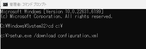 | ダウンロード | setup.exe /download configuration.xml | インストール用ファイルを インターネットから取得して保存します。 (インストールはされません) |