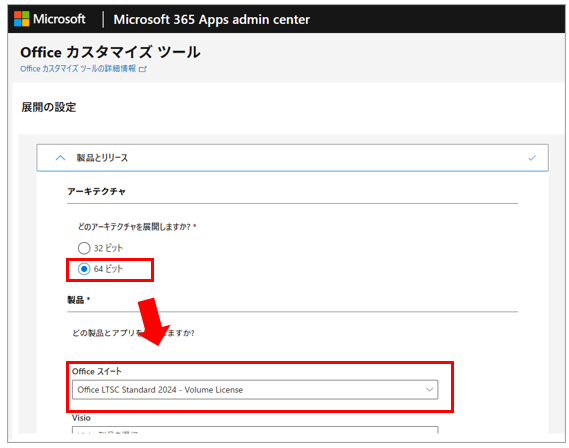 2.製品とリリースより、「アーキテクチャ:64ビット」、「製品:任意の製品」を選択します。