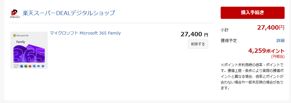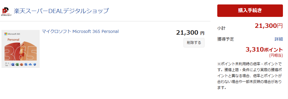 Microsoft 365 Personal は、過去に実施された 楽天スーパーSALE で「カード版」と「オンラインコード版」どちらにも10%程度のポイント還元が適用されています。